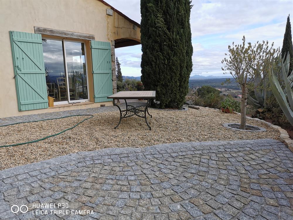 Possibilité de pose de pavés porphyre et grès d'Inde, et dallage granit bouchardé (avec délais de livraison)